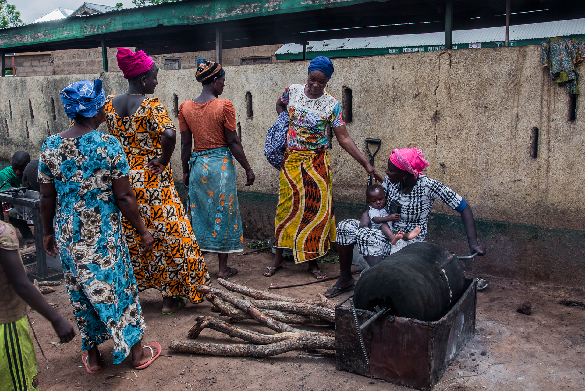 Fuseine Yakubu (in blue) and Fatima Iliasu, with baby Hidaya (in yellow) boil shea butter, the final step before cooling and packaging. All the women contribute to the production process. When asked about income specifics, they laugh, and Yakuta says they don't keep financial records. They turn a small profit, Iliasu said, but not as much as the woman who sells the finished product.